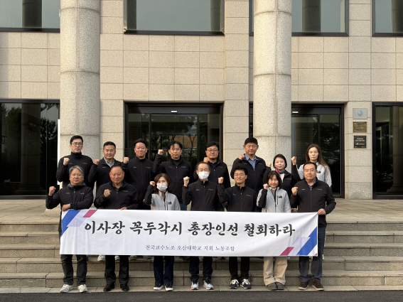 전국교수노동조합 오산대지회 교수들은 2025. 10. 30() 대학본부 앞에서 신임총장으로 임명된 황홍규 씨의 취임을 반대하는 조합원 궐기대회를 개최하였다.