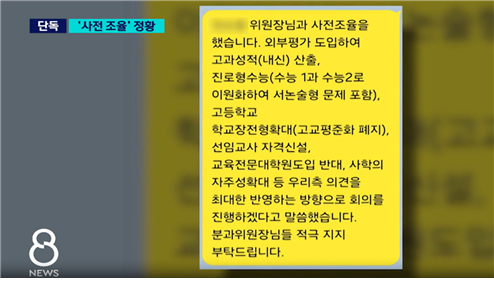 언론 보도와 당시 국교위원들의 증언에 따르면, 김 전 전문위원은 20247월 국교위 중장기 교육발전 전문위원 카카오톡 채팅방에 전문위원장과의 사전 조율을 전제로 우리 측의 방향을 관철시키자는 취지의 이른바 짬짜미 문자메시지를 올린 것으로 알려졌다. 이 메시지는 고교평준화 폐지, 수능 이원화, 고교 내신 외부평가제 도입 등에 대해 사실상 사전 담합을 시도한 것으로 해석되며, 이는 국교위가 표방해 온 사회적 합의 및 공론 절차와 정면으로 배치된다.