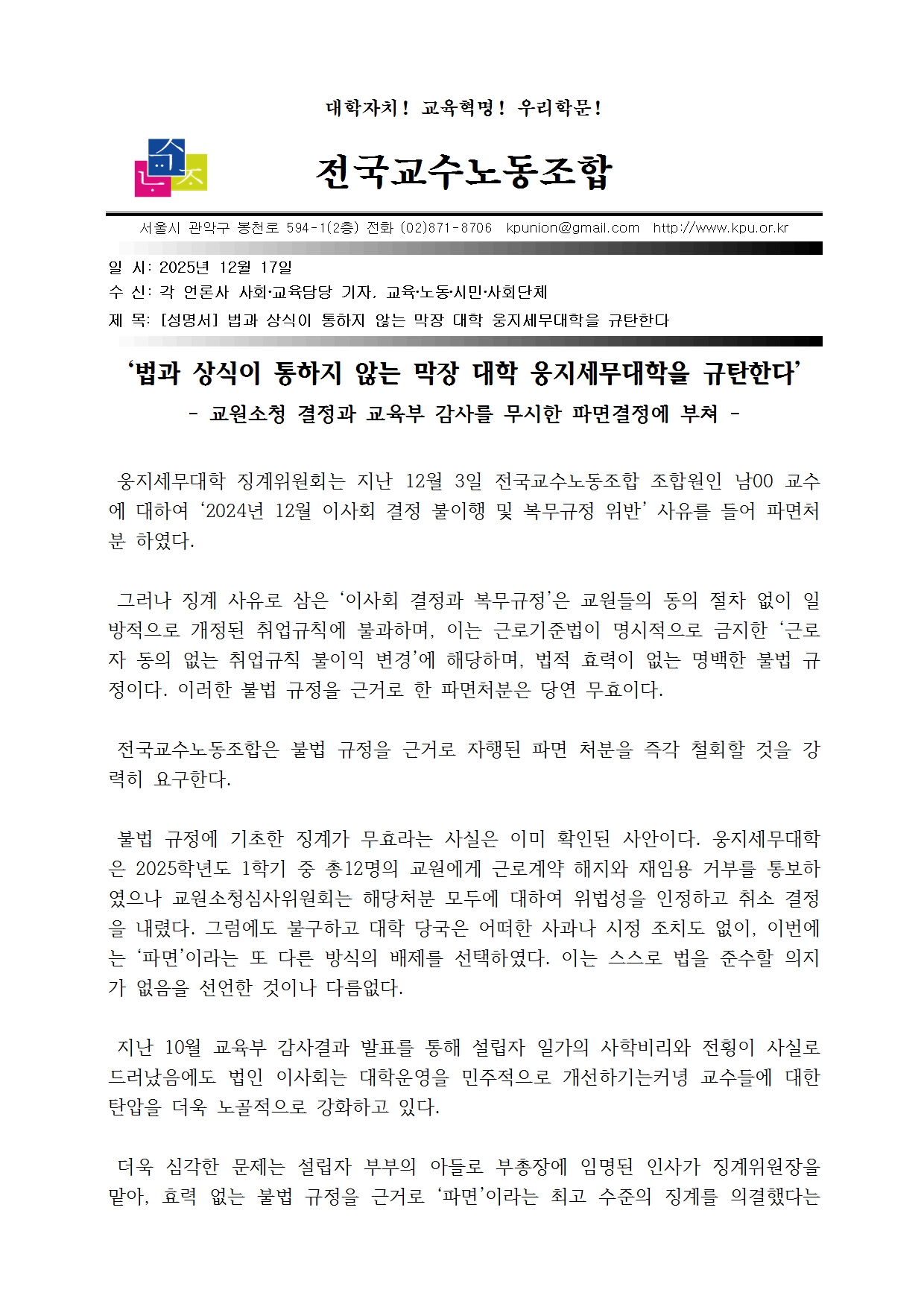 웅지세무대학 징계위원회는 지난 12월 3일 전국교수노동조합 조합원인 남00 교수에 대하여 ‘2024년 12월 이사회 결정 불이행 및 복무규정 위반’ 사유를 들어 파면처분 하였다.