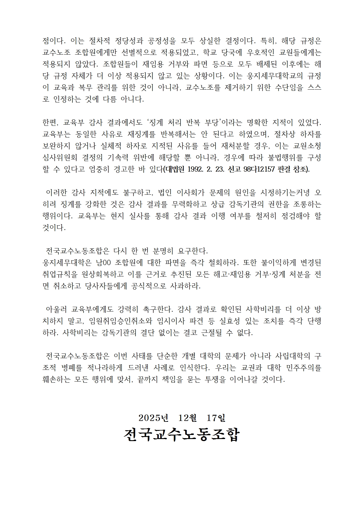 전국교수노동조합은 이번 사태를 단순한 개별 대학의 문제가 아니라 사립대학의 구조적 병폐를 적나라하게 드러낸 사례로 인식한다우리는 교권과 대학 민주주의를 훼손하는 모든 행위에 맞서끝까지 책임을 묻는 투쟁을 이어나갈 것이다.